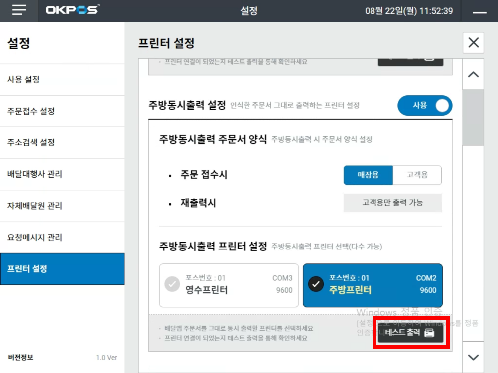6. [테스트 출력]을 통해 주방프린터 연결이 잘 되었는지 확인하세요
