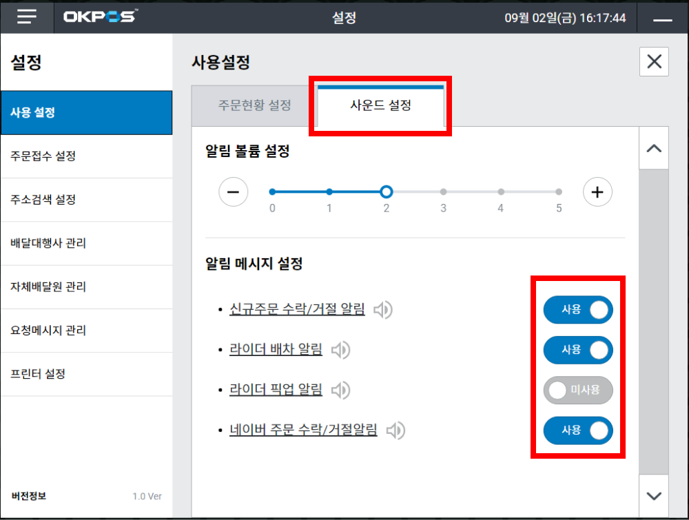 3. 주문접수 프린터 설정 : [미사용] 버튼 클릭하여 [사용]으로 변경합니다