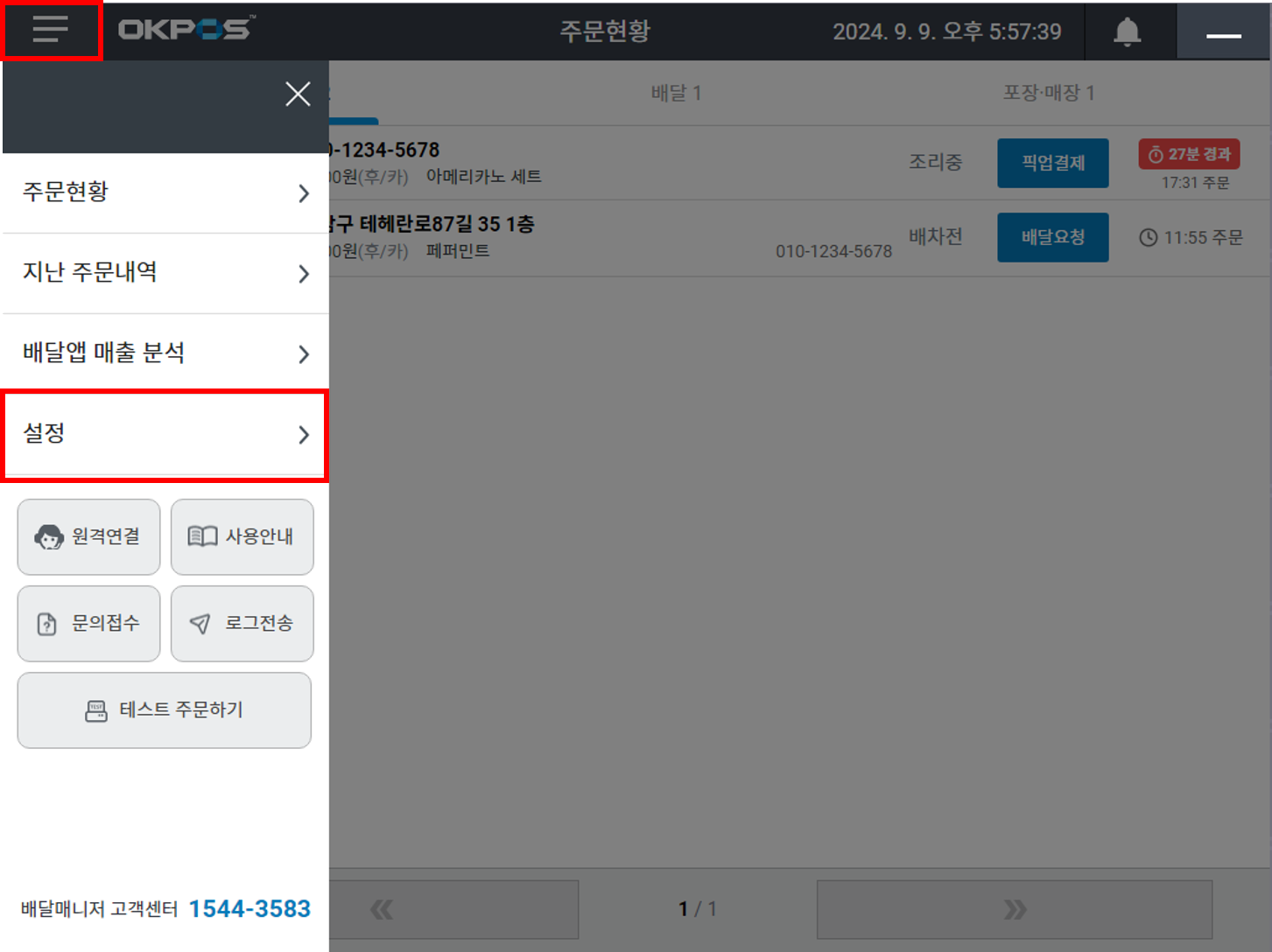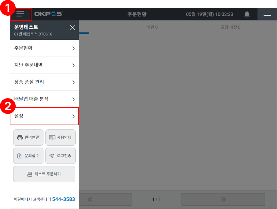 ① 배달매니저 좌측 상단 메뉴 버튼 클릭 → ② 설정