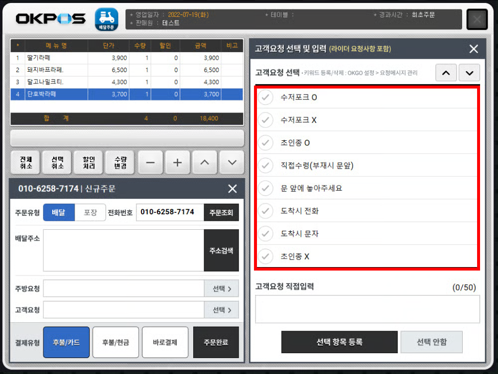 고객요청 메세지는 주방주문서 및 배달전표에 출력됩니다
