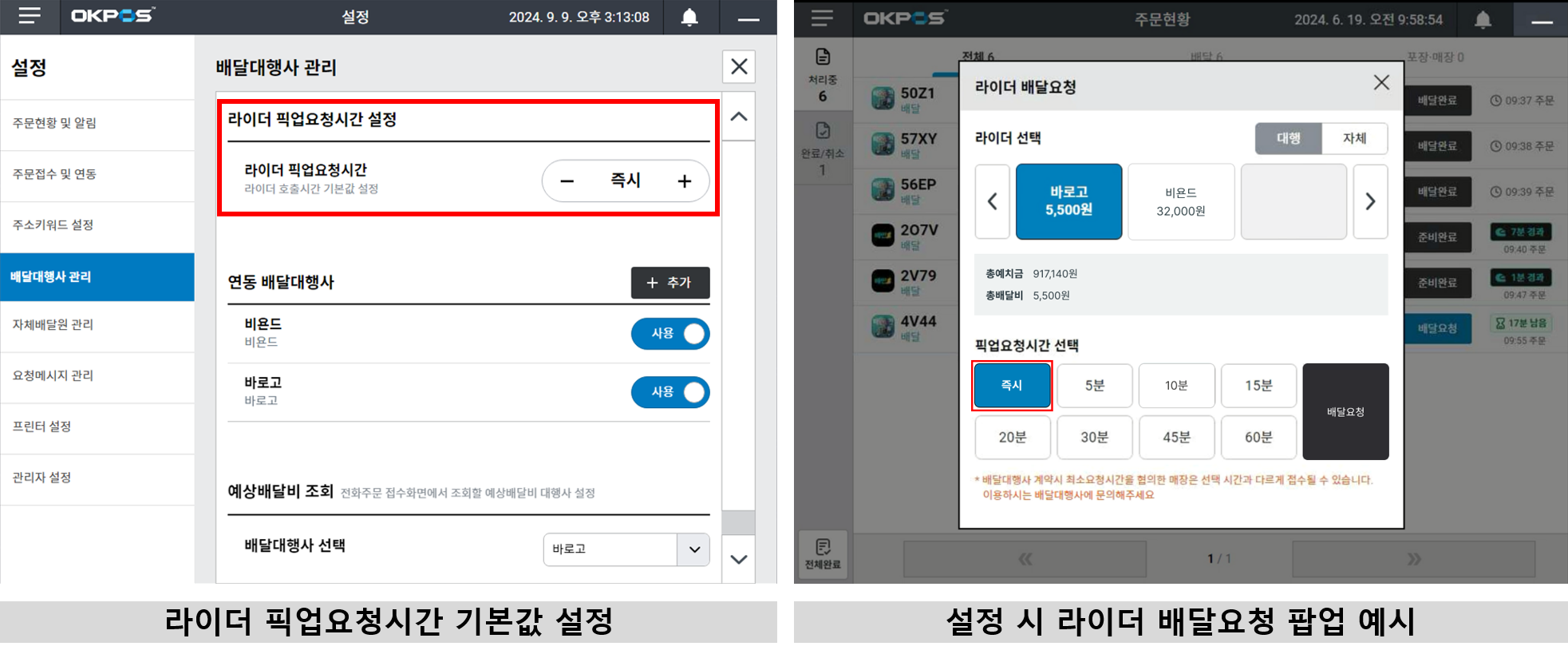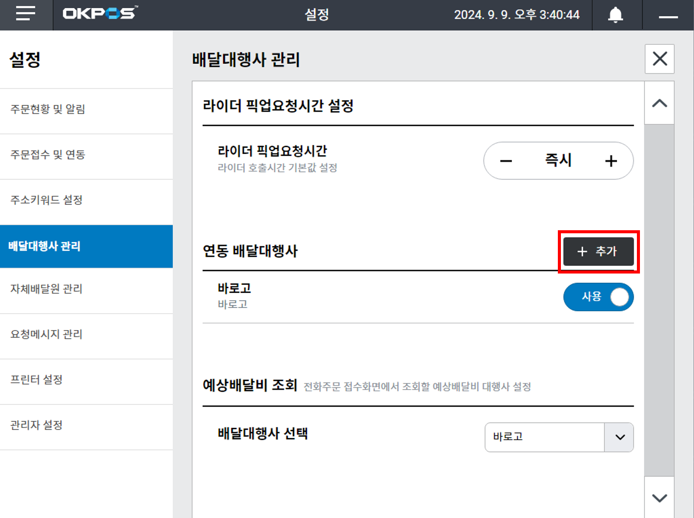 연동된 배달대행사 조회 및 픽업요청시간 기본값을 설정합니다