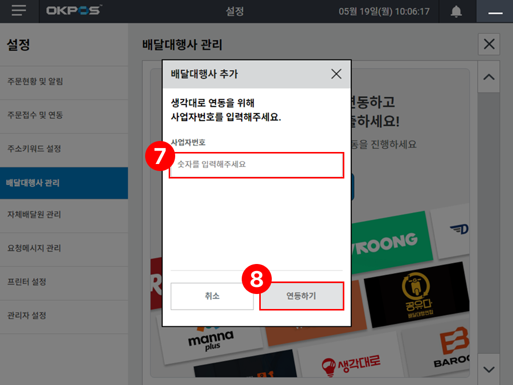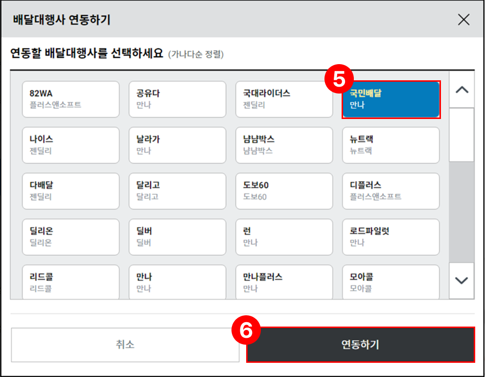 ⑤ 연동할 배달대행사 선택 → ⑥ 연동하기 클릭