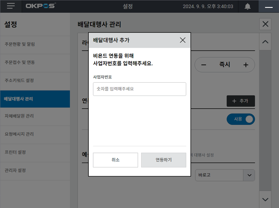 매장정보 확인 후 연동이 필요합니다. 배달매니저 고객센터(1544-3583)로 연락주세요.
