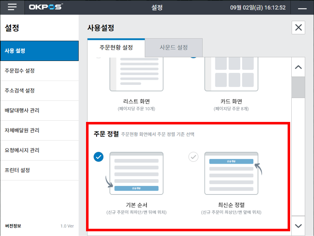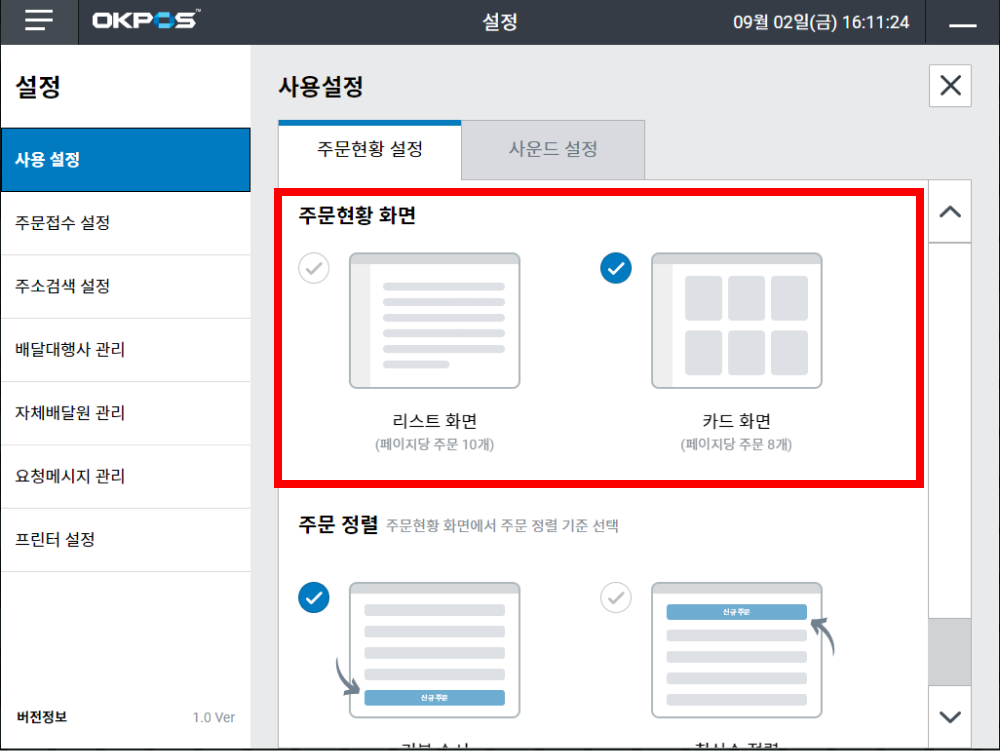 주문현황 화면 타입, 주문 정렬 순서 등을 설정합니다.