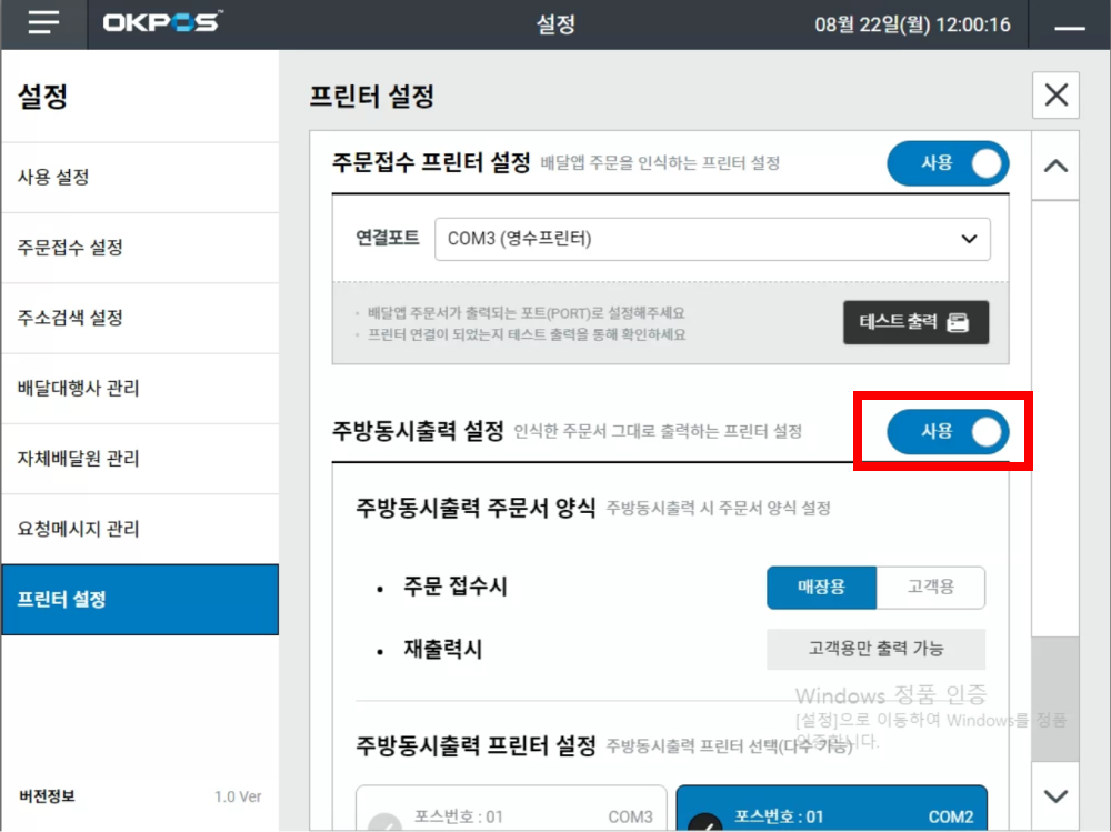 3. 주방동시출력 설정에서 [미사용]을 클릭해 [사용]으로 변경합니다.