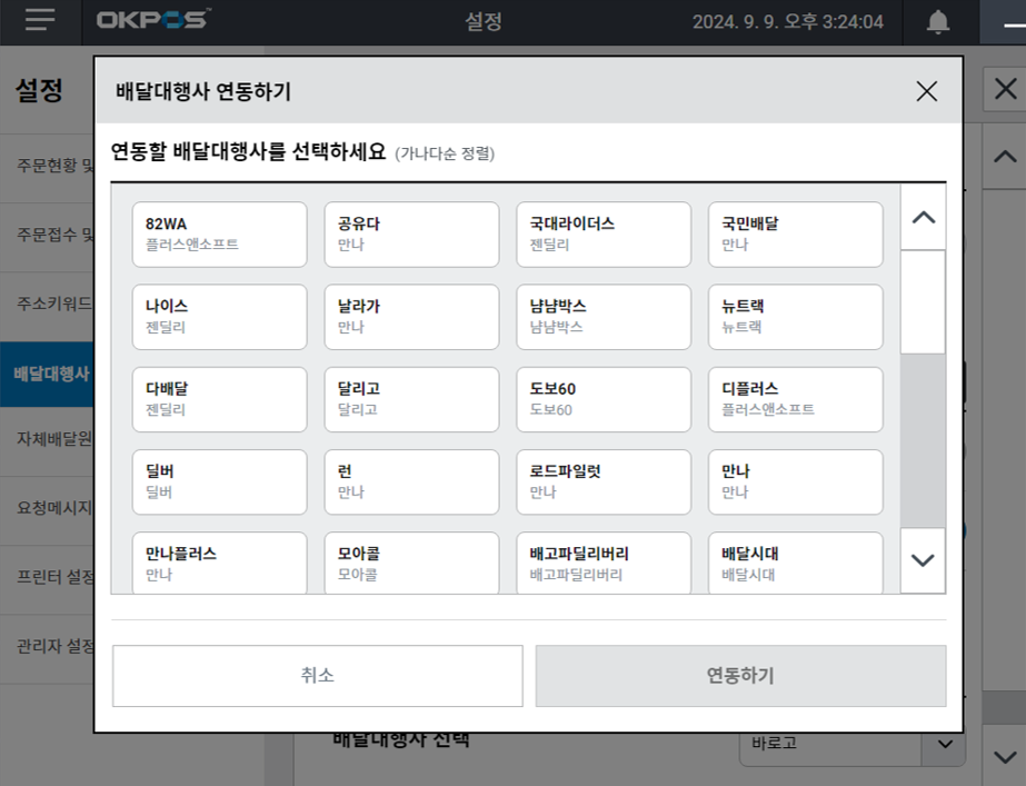 5. 배달매니저와 연동된 배달대행사 목록을 조회합니다 사용 설정이 되어있어야 라이더 요청팝업에 배달대행사가 조회됩니다.