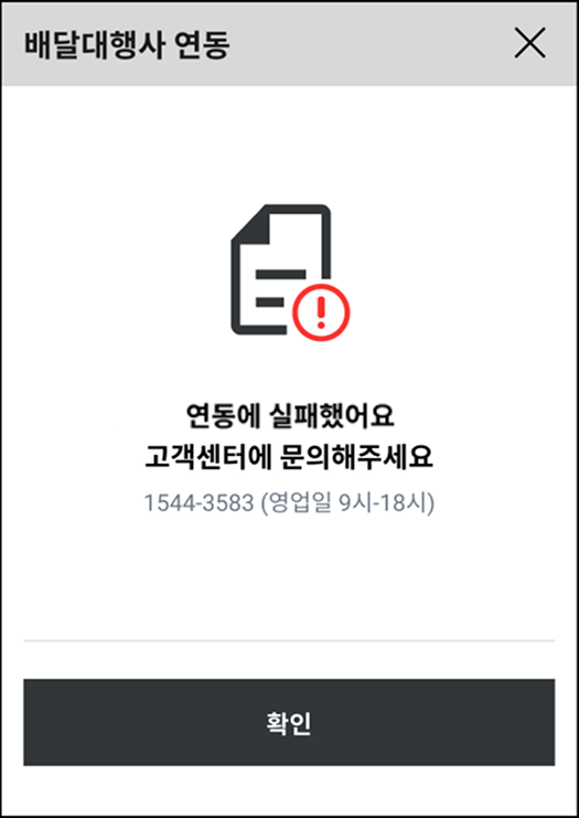 만약 실패 알림을 받았다면 포스 프로그램을 재실행하고, 다시 시도해주세요 인식에 실패한다면, 배달매니저 고객센터(1544-3583)로 문의주세요.