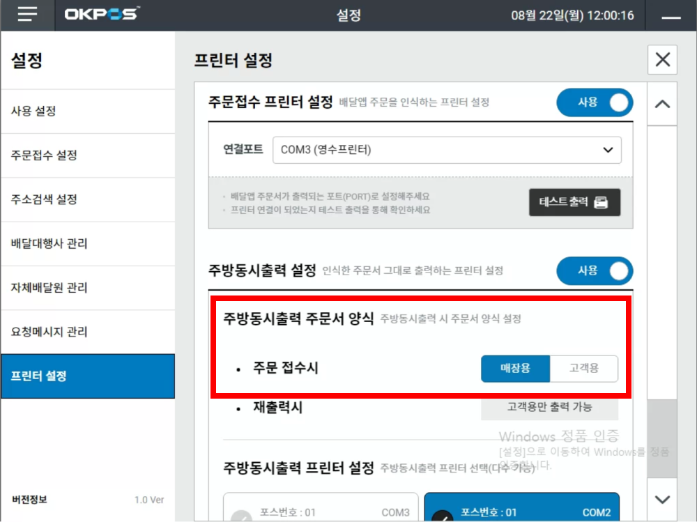 주방동시 프린터에 출력되려면 주문접수 프린터에 해당 양식이 먼저 출력되어야 합니다.