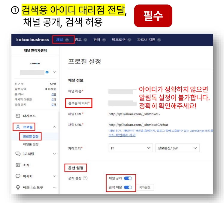 ① 대리점에 검색용 아이디를 전달하고, '채널 공개', '검색 허용'을 해주세요