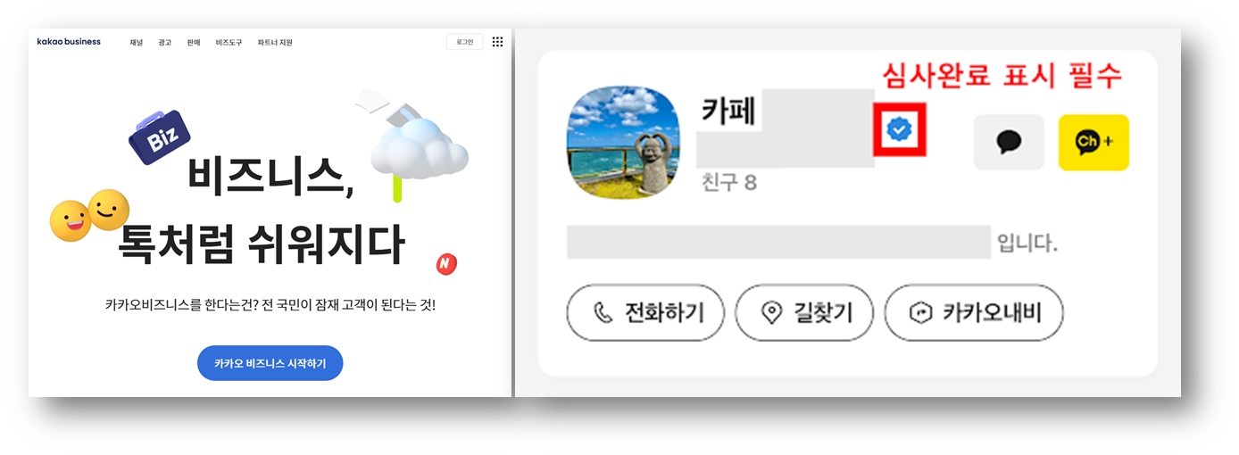 ① 가맹점에서 카카오 비즈니스채널 개설 후 심사승인을 완료해주세요. (영업일 3~5일 소요)