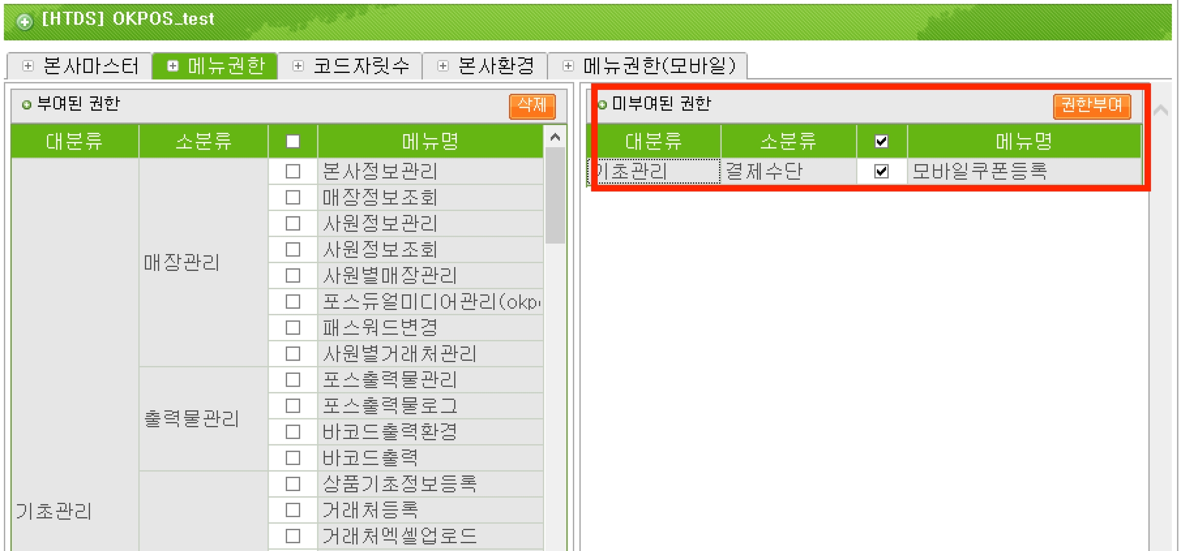 프랜차이즈 본사라면 시스템관리> 본사/매장마스터> 본사정보관리 > 메뉴권한 탭에서 모바일쿠폰등록 페이지 메뉴권한을 추가해 주세요.