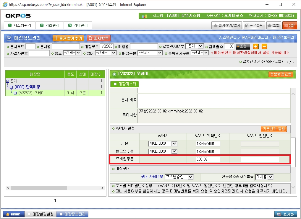 ⑥ 모바일쿠폰을 설정할 매장을 조회 후 매장마스터 하단의 VAN사 설정 >모바일쿠폰 항목에 모바일쿠폰 업체에서 부여 받은 코드번호를 입력해 주세요