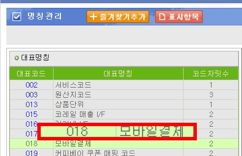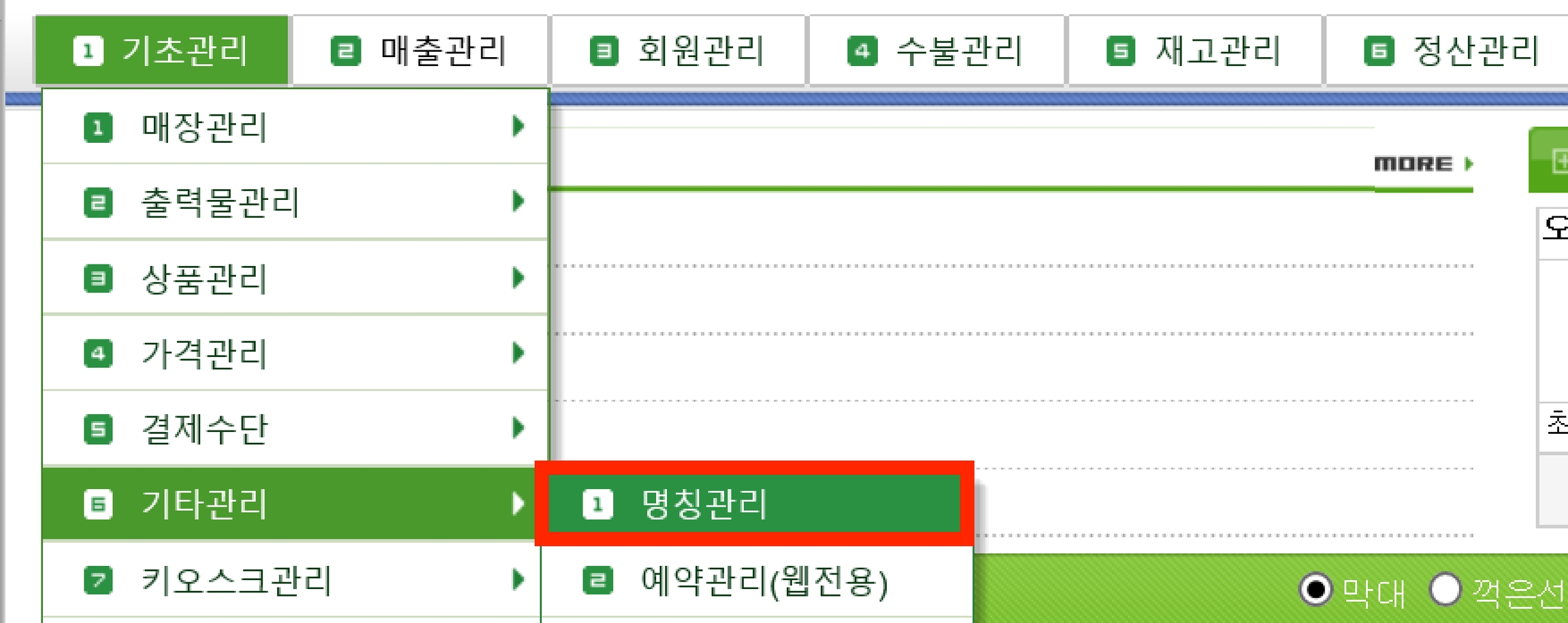 ② 가맹점 영업정보시스템에서 기초관리> 기타관리> 명칭관리로 이동하세요.