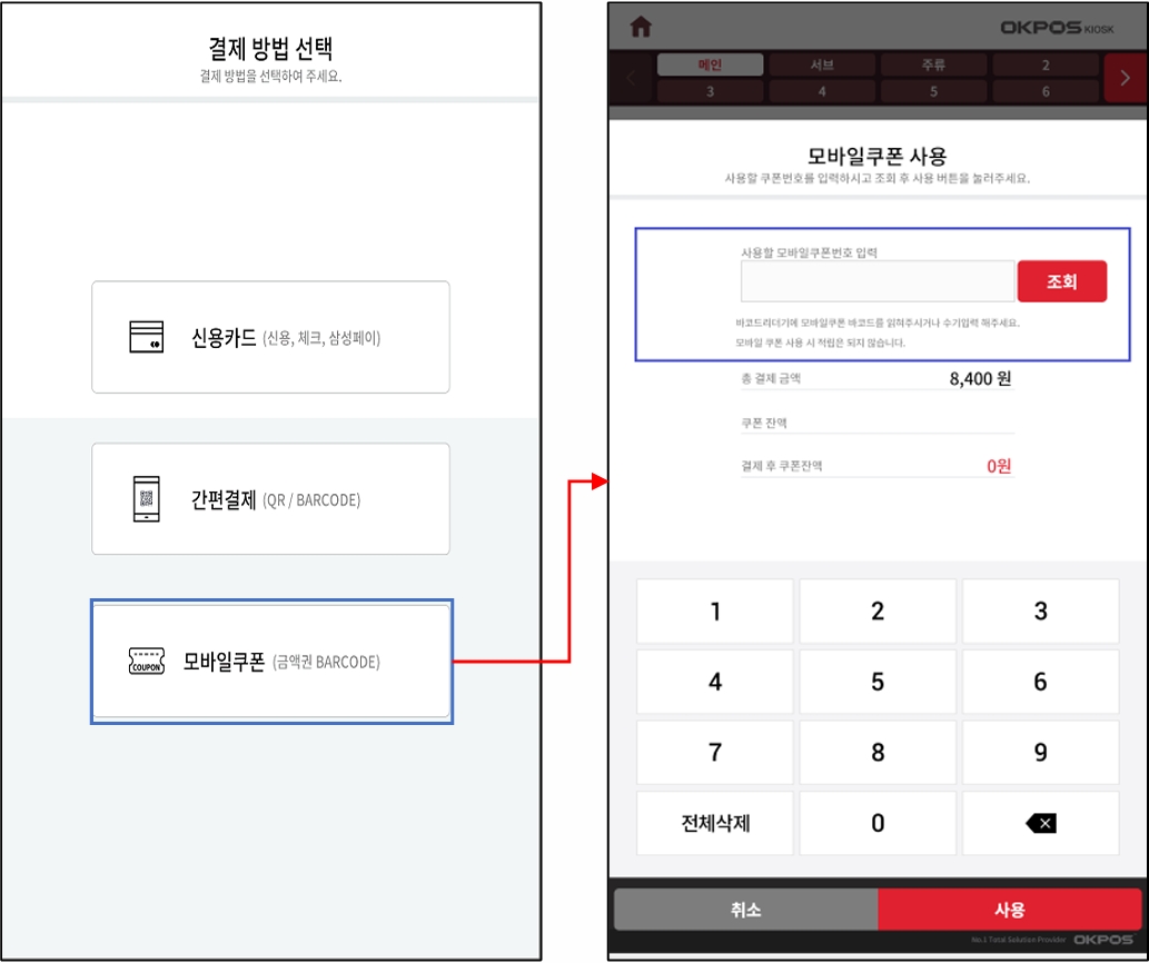 ⑧ 결제메뉴에 모바일쿠폰 기능키를 추가해주세요. (결제 메뉴 설정 참고)