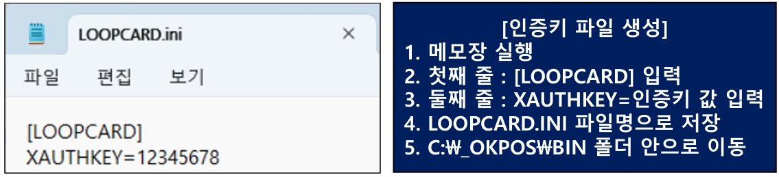 ⑥ 메모장에 [인증키 파일]을 생성 후 포스기 C드라이브에 있는 오케이포스 폴더에 붙여넣어주세요.