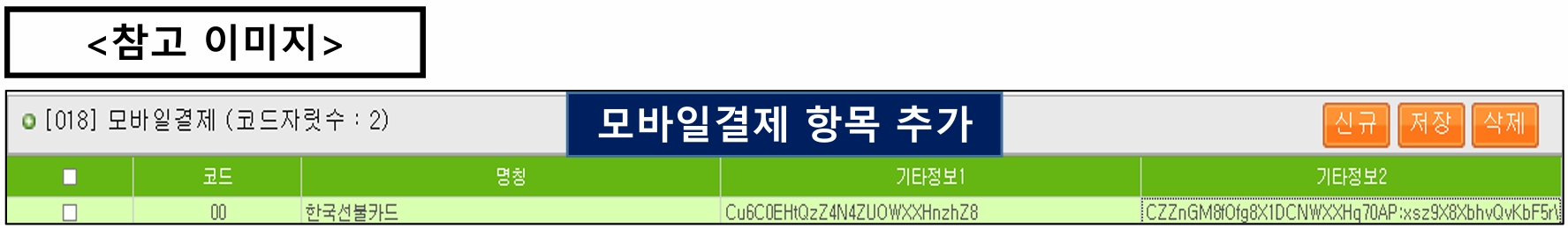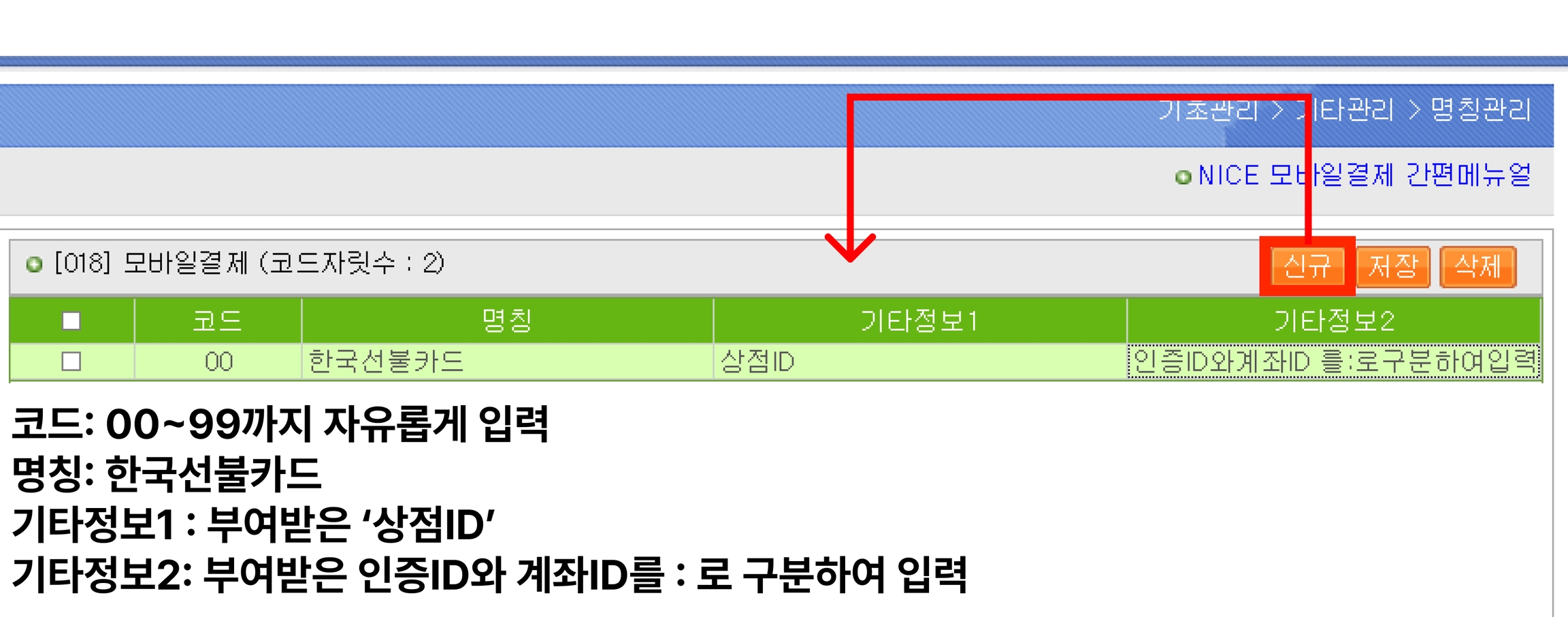 ④ 모바일결제 입력창에서 [신규]버튼을 클릭하여 행을 생성한 후 아래 내용에 따라 입력하세요.