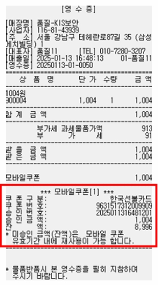 한국선불카드는 추가로 [702]모바일쿠폰결제선택–“금액권” 설정이 필요합니다.