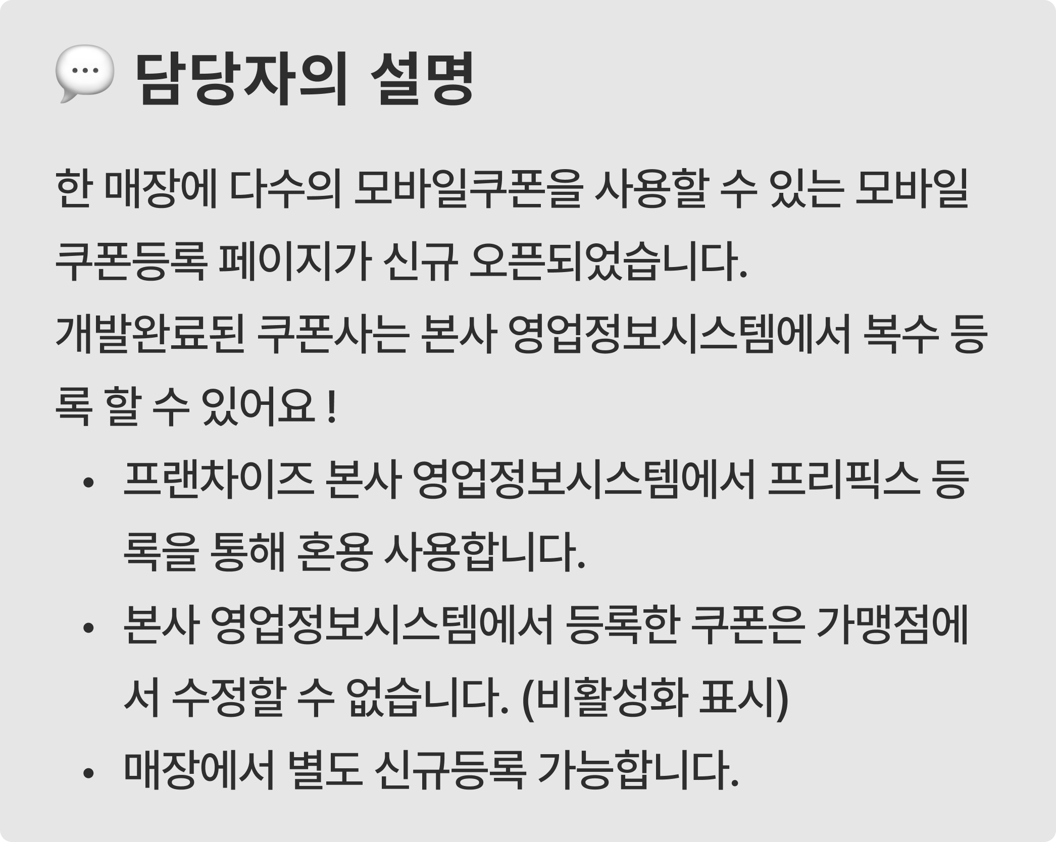 ② 본사/ 가맹점 영업정보시스템에 접속하여 추가된 모바일쿠폰등록 페이지에서 쿠폰을 설정해주세요.