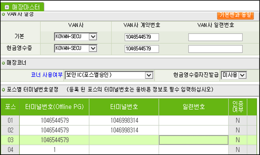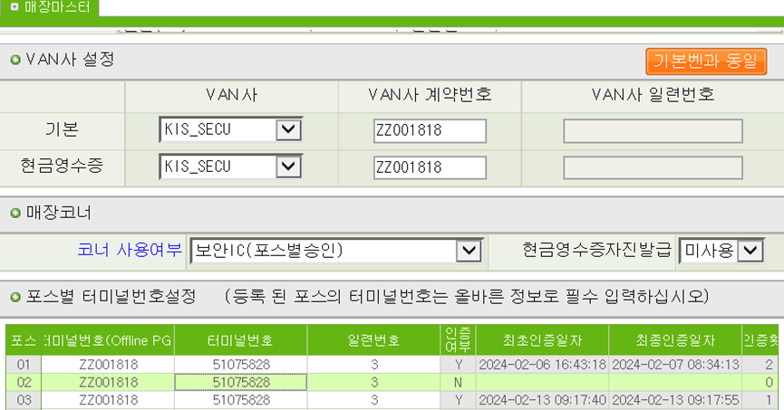 ๋ฉ๋ด์์น: ๋งค์ฅ์ ๋ณด๊ด๋ฆฌ > VAN์ฌ ์ค์ > ํฌ์ค๋ณ ํฐ๋ฏธ๋๋ฒํธ์ค์ โ ํฐ๋ฏธ๋ ๋ฒํธ(Offline PG) : PG TID ์ ๋ ฅ, ํฐ๋ฏธ๋ ๋ฒํธ : VAN TID ์ ๋ ฅ