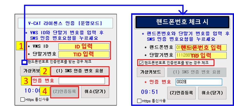 ํธ๋ํฐ์ผ๋ก ์ธ์ฆ๋ฐ๋ ๊ฒฝ์ฐ, VMS ID์ ํธ๋ํฐ ๋ฒํธ๋ฅผ ์ ๋ ฅํฉ๋๋ค.