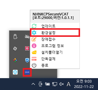 2. ๋ฐํํ๋ฉด ์ค๋ฅธ์ชฝํ๋จ NHNKCPSecureVCAT ์ฐํด๋ฆญ> ํ๊ฒฝ์ค์ >๊ฐ๋งน์ ์ ๋ณด ์ ๋ ฅ ๋ฐ ์ฅ๋น์ค์