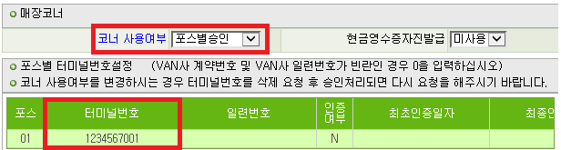 2. ๋งค์ฅ์ฝ๋ : ์ฝ๋ ์ฌ์ฉ์ฌ๋ถ ํฌ์ค๋ณ์น์ธ ์ ํ / ํฐ๋ฏธ๋๋ฒํธ(๋จ๋ง๊ธฐ๋ฒํธ) ์ ๋ ฅ