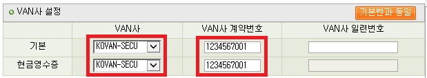 1. VAN์ฌ ์ค์ : VAN์ฌ KOVAN_SECU ์ ํ / VAN์ฌ ๊ณ์ฝ๋ฒํธ(๋จ๋ง๊ธฐ๋ฒํธ) ์ ๋ ฅ