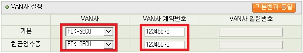 1. VAN์ฌ ์ค์ : VAN์ฌ FDK_SECU ์ ํ / VAN์ฌ ๊ณ์ฝ๋ฒํธ(๋จ๋ง๊ธฐ๋ฒํธ) ์ ๋ ฅ