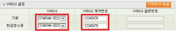 1. VAN์ฌ ์ค์ : VAN์ฌ STARVAN_SECU ์ ํ / VAN์ฌ ๊ณ์ฝ๋ฒํธ(๋จ๋ง๊ธฐ๋ฒํธ) ์ ๋ ฅ
